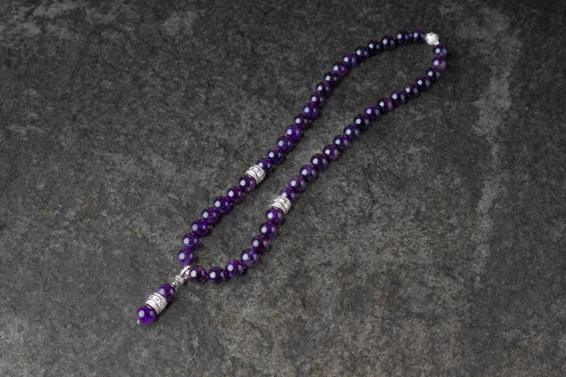 Präsentieren Sie Ihren individuellen Stil mit dieser exquisiten Amethysten-Kette. Diese atemberaubende Kette vereint die Schönheit von handverlesenen Amethysten, deren leuchtende Violetttöne in verschiedenen Schattierungen harmonisch miteinander kombiniert sind.